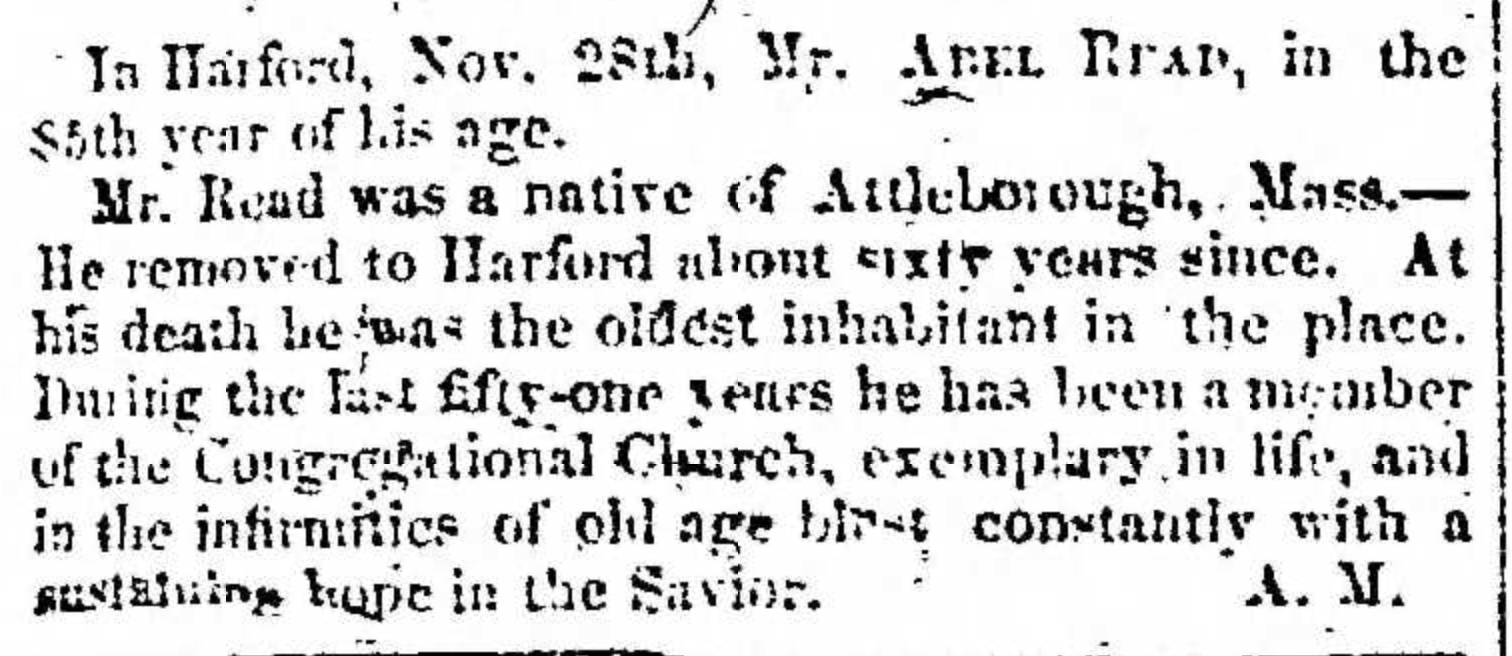 | Read | Abel | 28 Nov 1857 | “Abel Read,” obituary, Montrose Independent Republican (Montrose, Pennsylvania), 3 Dec 1857, p. 3, col. 1. |