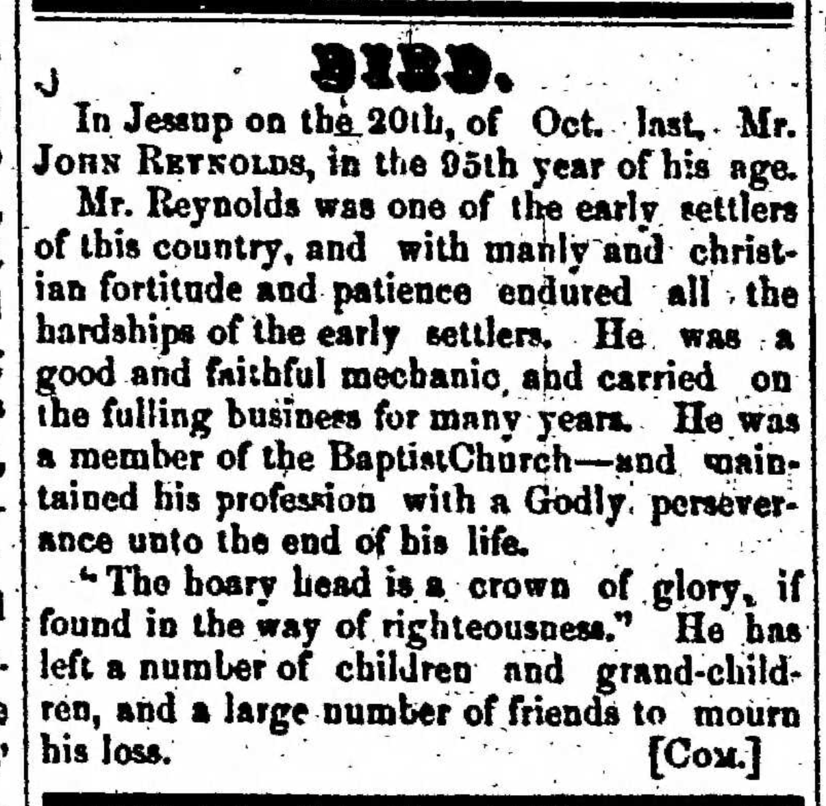 | Reynolds | John | 20 Oct 1856 | “John Reynolds,” obituary, Montrose Democrat (Montrose, Pennsylvania), 1 Jan 1857, p. 2, col. 6. |