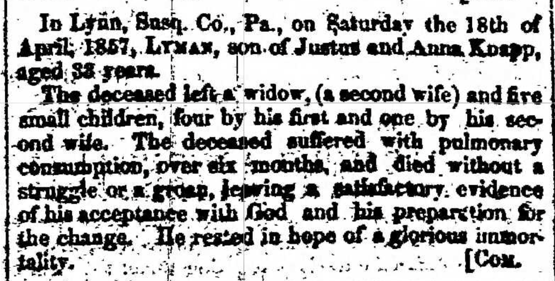 | Knapp | Lyman | 30 Apr 1857 | “Lyman Knapp,” obituary, Montrose Independent Republican (Montrose, Pennsylvania), 30 Apr 1857, p. 3, col. 2. |