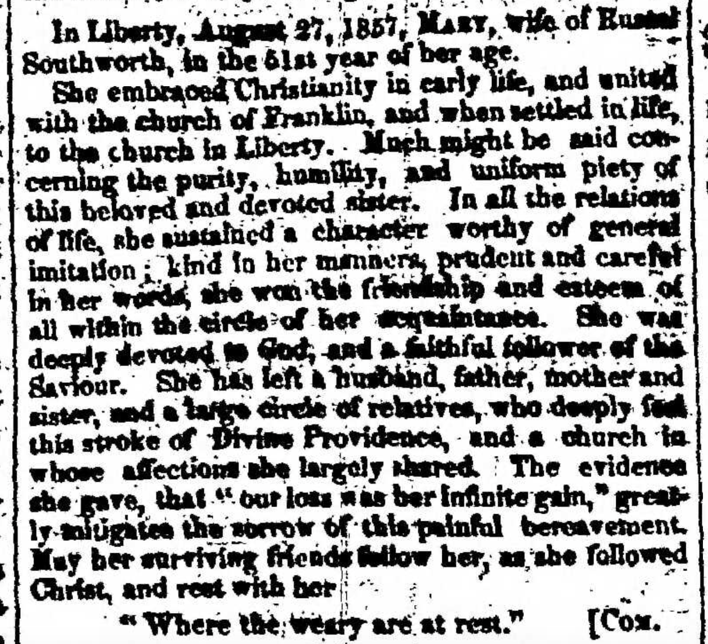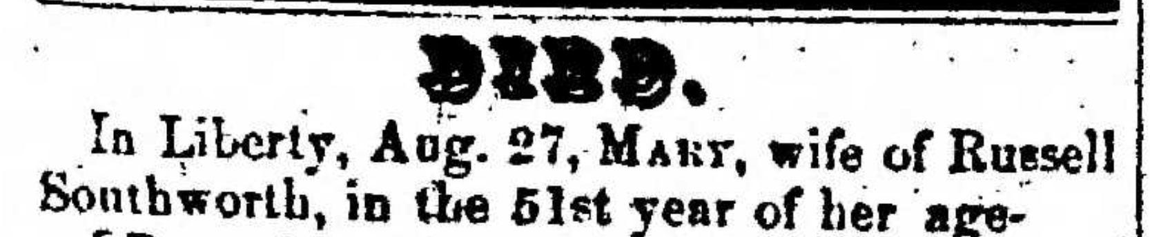 | Southworth | Mary | 27 Aug 1857 | “Mary Southworth,” death notice, Montrose Democrat (Montrose, Pennsylvania), 3 Sept 1857, p. 3, col. 1. “Mary Southworth,” obituary, Montrose Independent Republican (Montrose, Pennsylvania), 10 Sept 1857, p. 3, col. 2. |