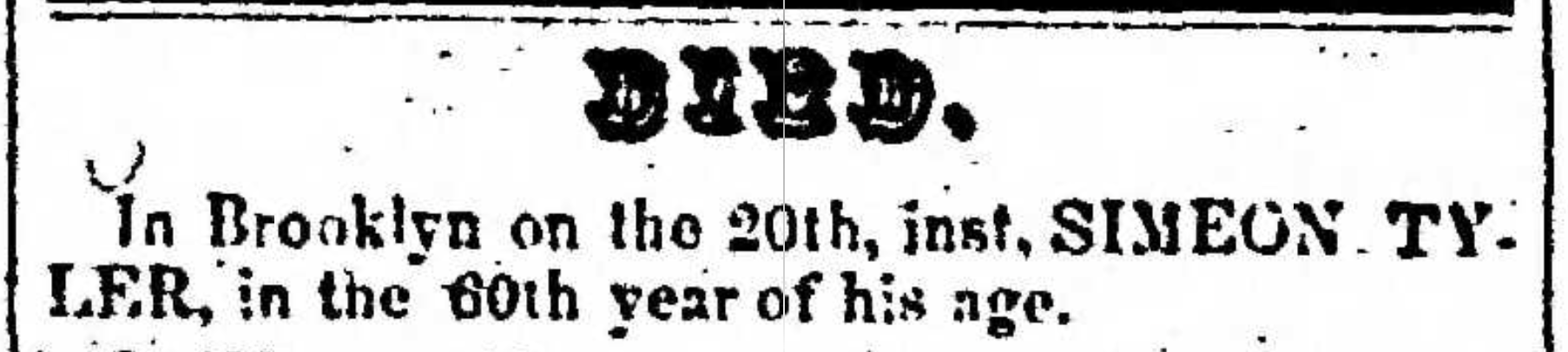 | Tyler | Simeon | 20 Oct 1857 | “Simeon Tyler,” death notice, Montrose Democrat (Montrose, Pennsylvania), 29 Oct 1857, p. 3, col. 2. |