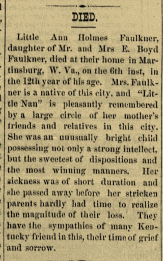 | Faulkner | Annie Holmes | 1883 | “Annie Holmes Faulkner, Daughter of Mr. and Mrs. E. Boyd, Dies,” death notice, Hopkinsville (Christian County, Kentucky) Semi-Weekly South Kentuckian, 21 Aug 1883, p. 3, col. 3 Daughter of Elisha Boyd Faulkner |