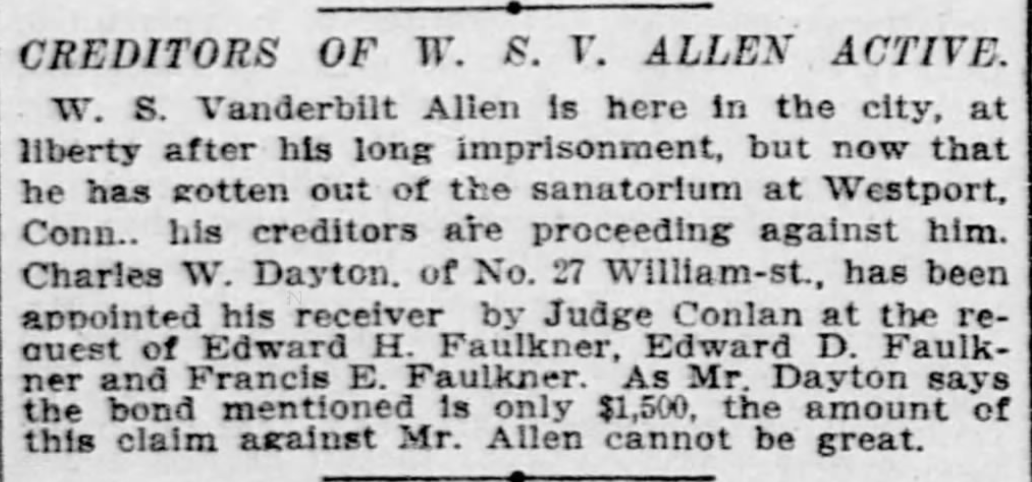 | Faulkner | Edward Henry | 1902 | “Creditors of W. S. V. Allen Active, Dayton Appointed Receiver at Request of Edward H. Faulkner et al,” news article, New-York Tribune (New York, New York), 5 Dec 1902, p. 6, col. 2. |