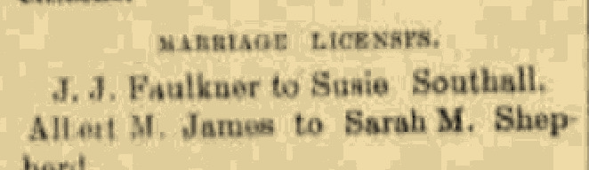 | Faulkner | Walter Raleigh | 1887 | “Walter R. Faulkner and Anna Ladd Marry,” marriage announcement, Hopkinsville Semi-Weekly South Kentuckian (Hopkinsville, Christian County, Kentucky), 14 Oct 1887, p. 3, col. 2 Son of Ephraim James Faulkner |