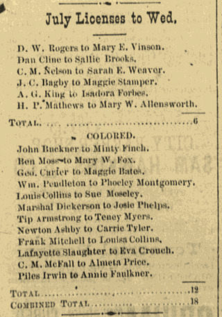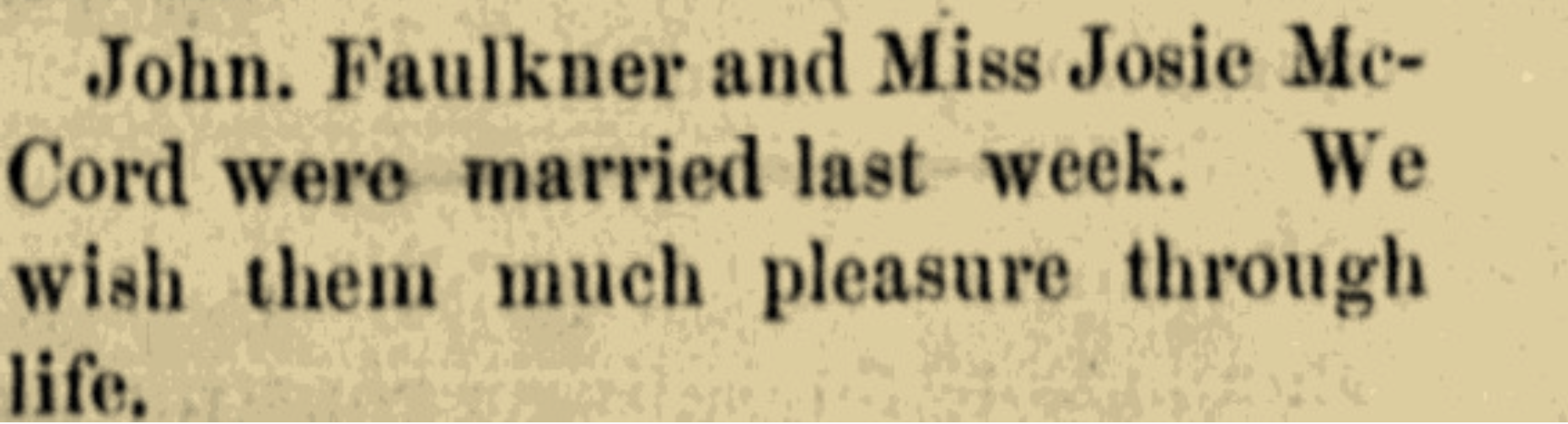 | Faulkner Cosby | Helen Lee | 1880 | “Whoop’ee, C. A. Cosby-Helen Faulkner, marriage announcement, Hopkinsville (Christian County, Kentucky) Semi-Weekly South Kentuckian, 6 Jan 1880, p. 1, col 7. |