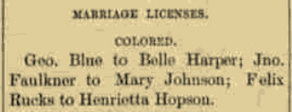 | Faulkner Hopson | Caroline | 1885 | “Marriage Licenses Issued to Three Dozen Couples, Abram Hopson-Caroline Faulkner,” news article, Hopkinsville (Christian County, Kentucky) Semi-Weekly South Kentuckian, 30 Jan 1885, p. 24, col. 4 |