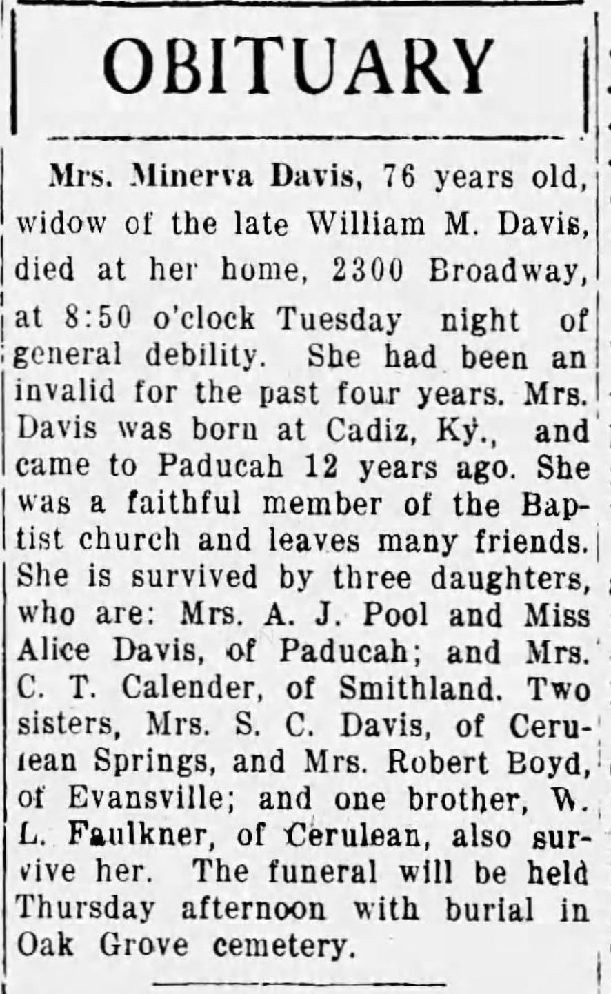 | Faulkner Davis | Minerva Jane | 1916 | “Mrs. Minerva Davis,” obituary, Paducah Sun-Democrat (Paducah, McCracken County, Kentucky), 26 Jul 1916, p. 4, col. 6. KFH MRCA: Hutchins Burton Faulkner and Elizabeth Gray |