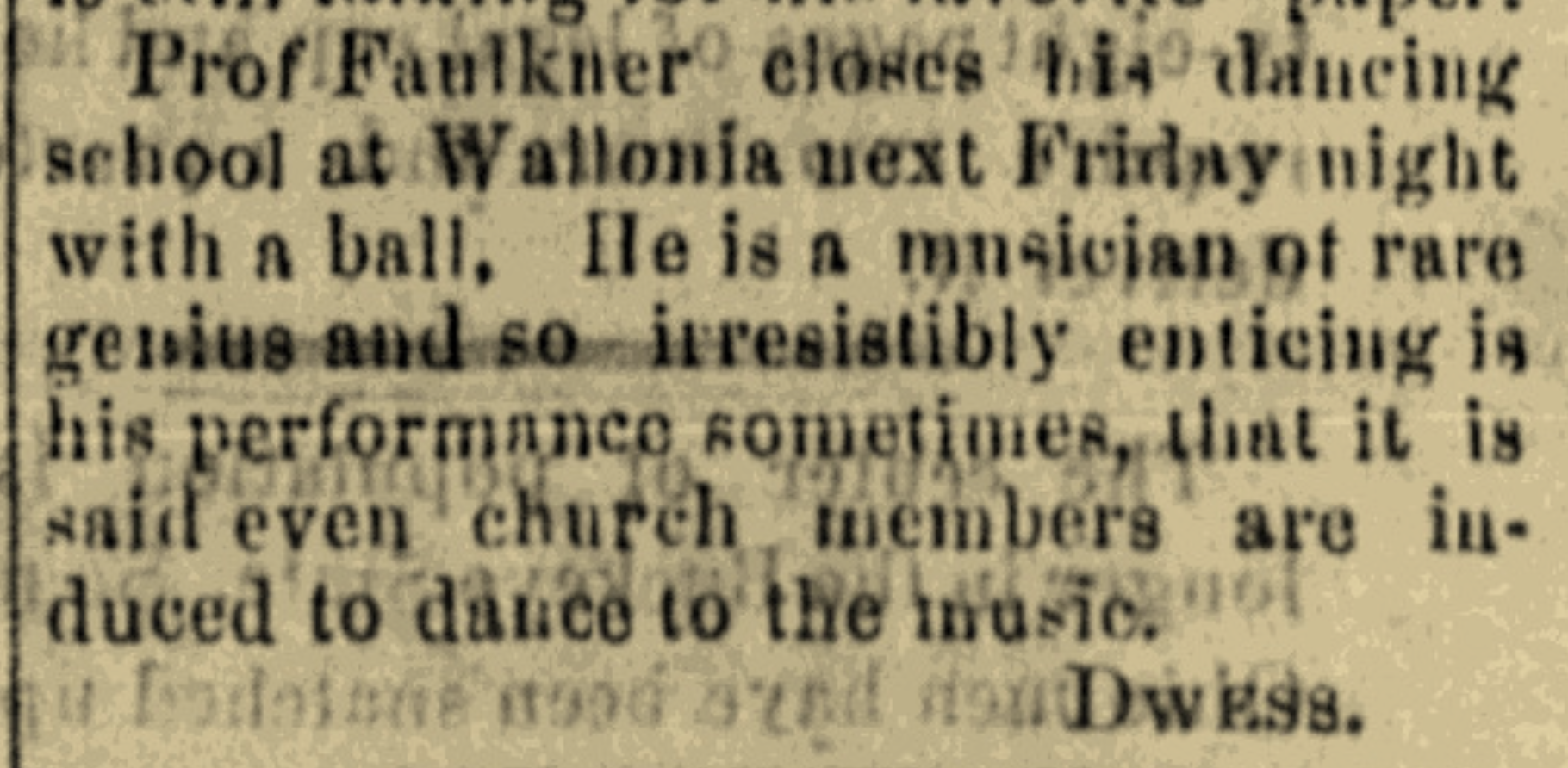 | Faulkner | Professor | 1881 | “Prof. Faulkner of Wallonia Closes Dancing School with Ball,” news article, Hopkinsville (Christian County, Kentucky) Semi-Weekly South Kentuckian, 5 Apr 1881, p. 1, col. 8 |