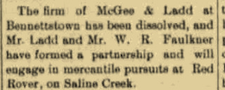 | Faulkner | Walter Raleigh | 1894 | “Ladd Bros. General Merchandise Business Sells to W. R. Faulkner,” news article, Hopkinsville (Christian County, Kentucky) Kentuckian, 6 Mar 1894, p. 5, col. 2. Son of Ephraim James Faulkner |