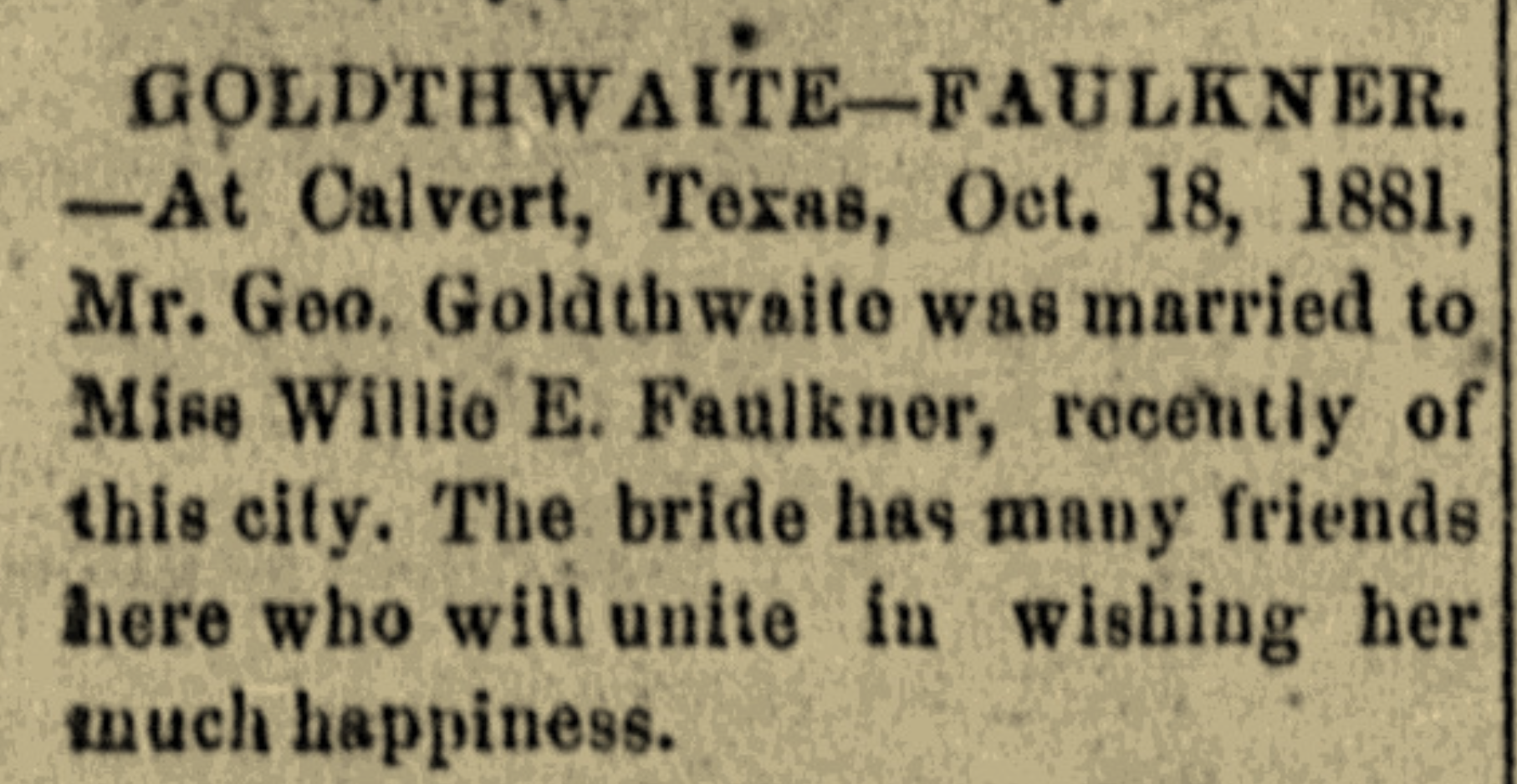 | Faulkner Goldthwaite | Willie Evelyn | 1881 | “Willie E. Faulkner and George Goldthwaite Marry in Texas,” marriage announcement, Hopkinsville (Christian County, Kentucky) Semi-Weekly South Kentuckian, 1 Nov 1881, p. 3, col. 1 |