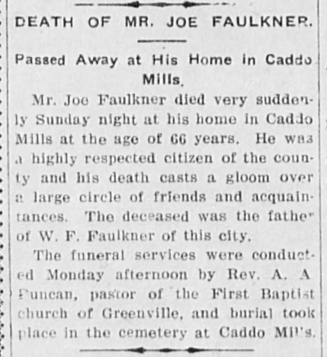 | Faulkner | David Lyndon “Lynn” | 1901 | “Mr. Lynn Faulkner,” obituary, Arkansas Democrat (Little Rock, Arkansas), 16 Aug 1901, p. 7, col. 5. Son of David and Catharine Esther Faulkner |