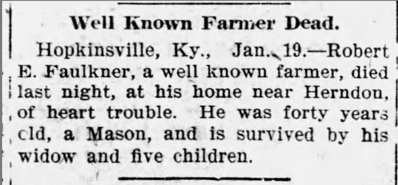 | Faulkner | Robert Ephraim | 1906 | “Well Known Farmer Dead,” Robert Ephraim Faulkner obituary, The Owensboro Messenger (Owensboro, Kentucky), 20 Jan 1906, p. 7, col. 2. Son of Ephraim James Faulkner |
