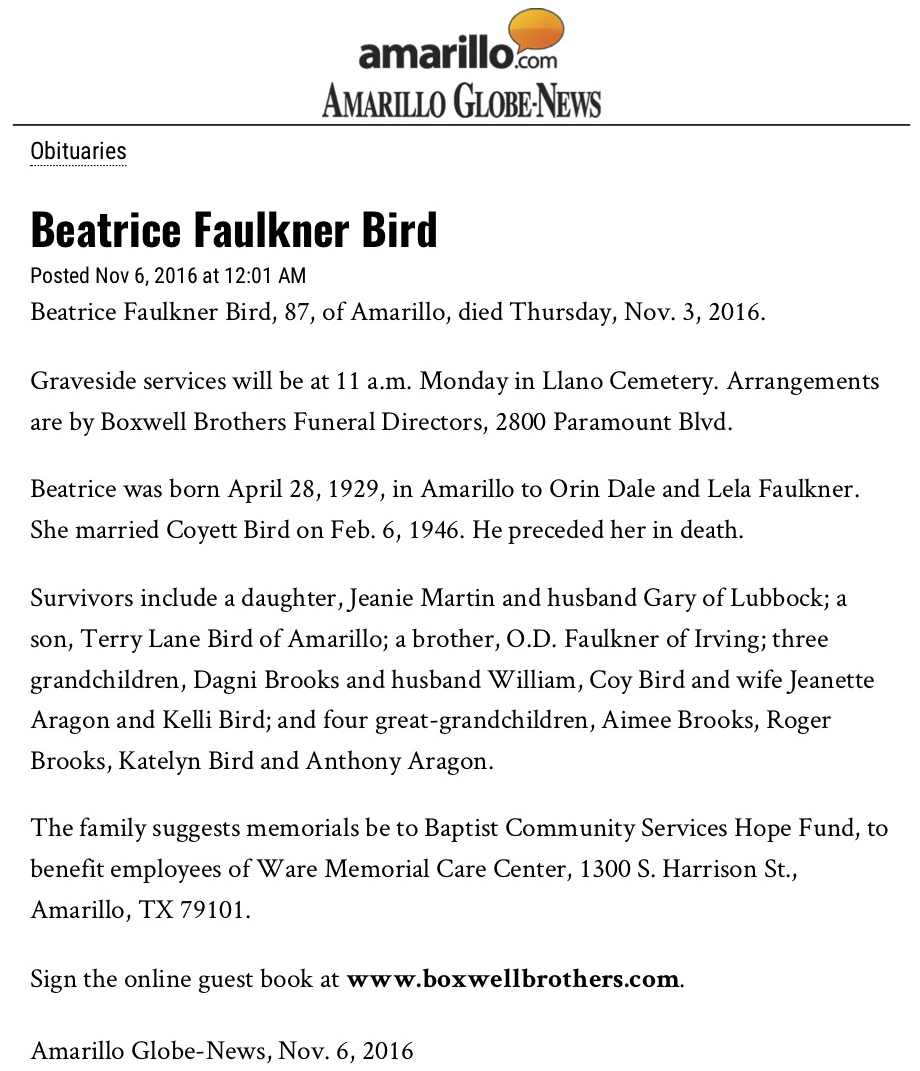 | Faulkner Bird | Beatrice | 2016 | “Beatrice Faulkner Bird,” obituary, Amarillo (Texas) Globe-News online edition, 6 Nov 2016. KFH MRCA: Hutchins Burton Faulkner and Elizabeth Gray |