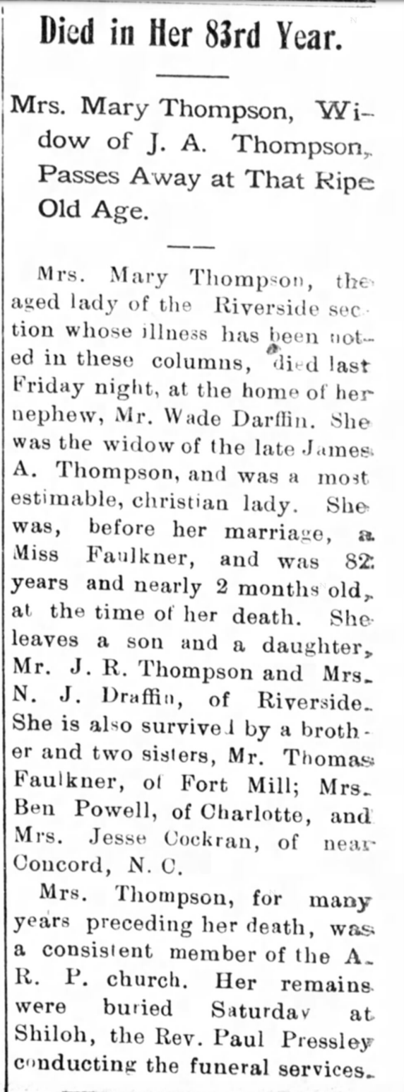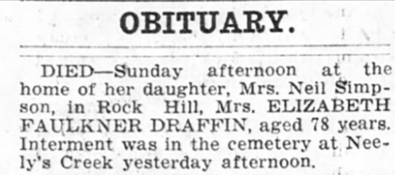 | Faulkner Draffin | Elizabeth Jane | 1922 | “Mrs. Elizabeth Faulkner Draffin,” obituary, Yorkville Enquirer (York, South Carolina), 14 Nov 1922, p. 5, col. 1 |