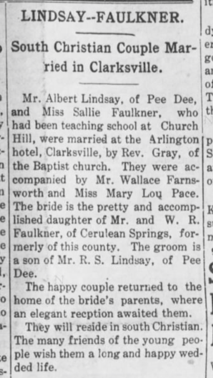 | Faulkner Lindsey | Sallie | 1908 | “Lindsay–Faulkner, South Christian Couple Married in Clarksville,” marriage announcement, Hopkinsville Kentuckian (Hopkinsville, Kentucky), 2 May 1908, p. 5, col. 4. |
