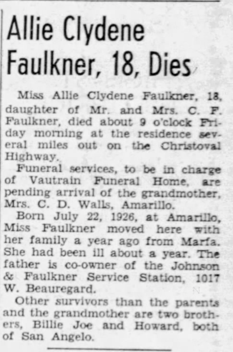 | Faulkner | Allie Clydene | 1944 | “Allie Clydene Faulkner, 18, Dies,” obituary, San Angelo Evening Standard (San Angelo, Texas), 25 Aug 1944, p. 18, col. 8. |