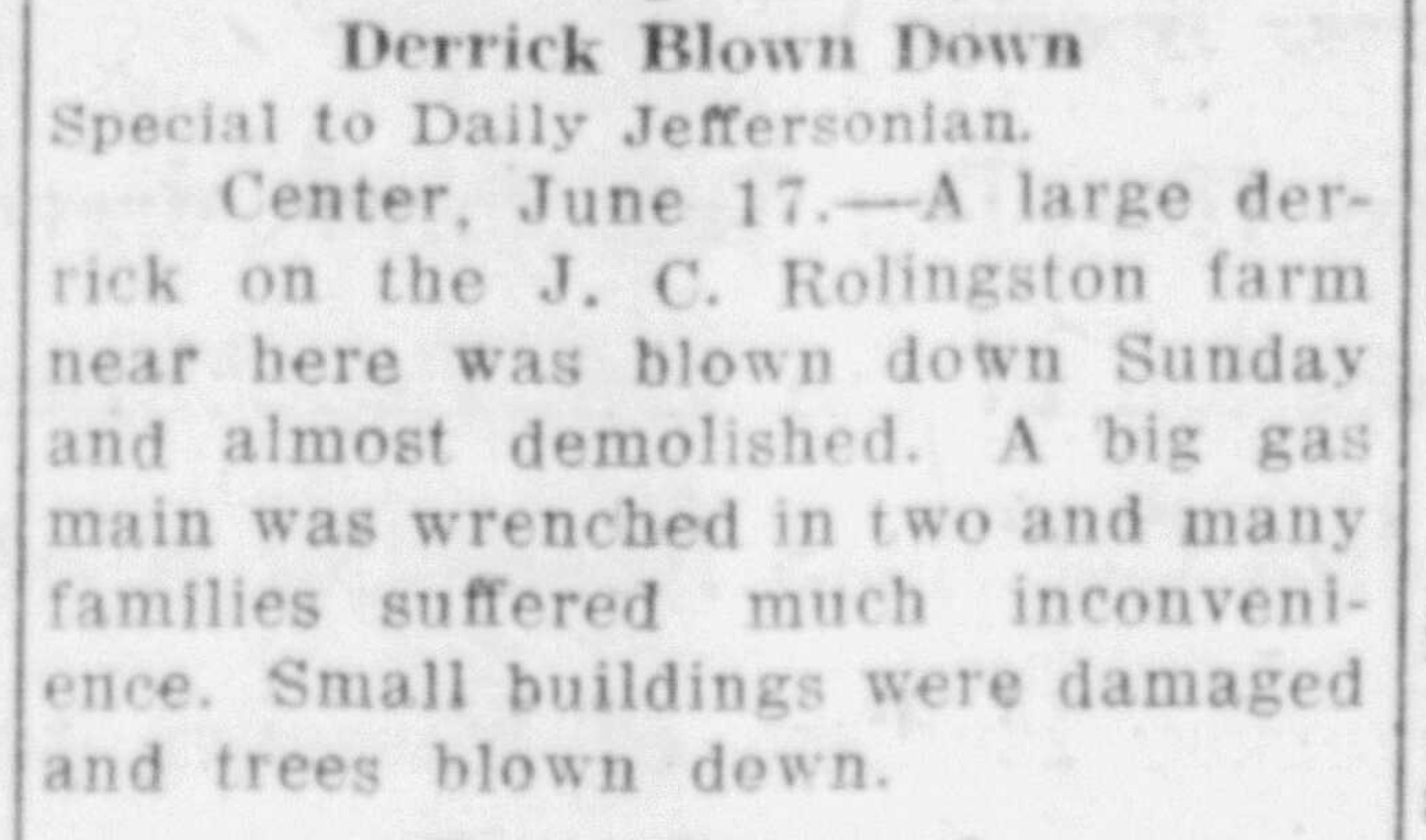 | Rolingson | John Christopher | 1912 | Derrick Blown Down at J. C. Rolingston Farm, news article, Cambridge Jeffersonian (Cambridge, Guernsey County, Ohio), 20 June 1912, p. 2, col. 4. Spouse of Elizabeth A. Thomas, KFH MRCA: Jesse Thomas and Catherine “Katy” Ader |
