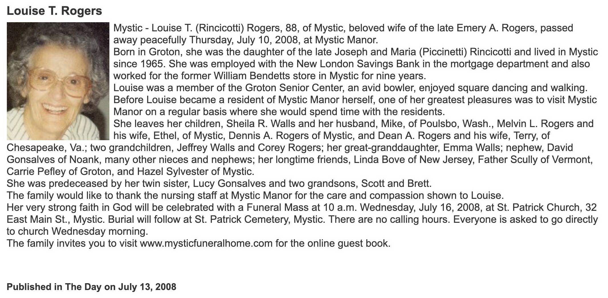 | Rincicotti Rogers | Louise T. | 2018 | “Louise T. Rogers,” obituary, The Day online edition (Mystic, Connecticut), 13 Jul 2018. Spouse of Emery Allison Rogers, GKH MRCA: Hull |