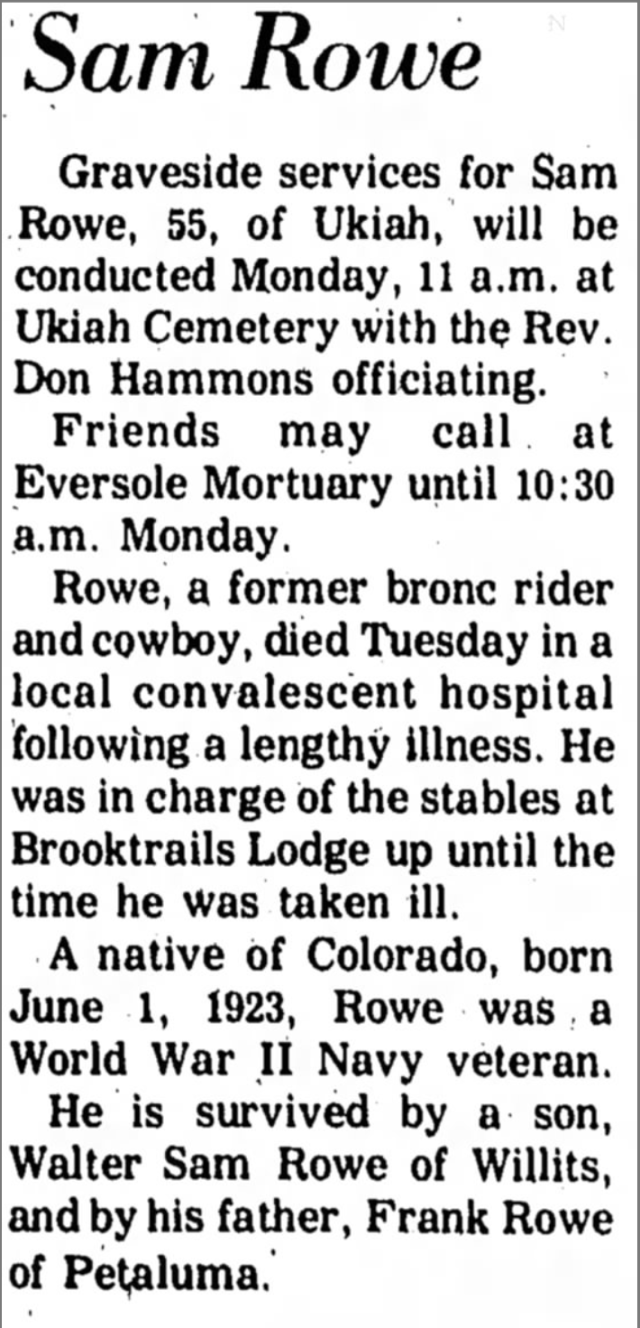| Rowe | Sylvester Allen “Sam” | 1978 | “Sam Rowe,” obituary, Ukiah Daily Journal (Ukiah, California), 18 Aug 1978, p. 3, col. 5. GKH MRCA: William N. Rowe and Candace Blanchard |