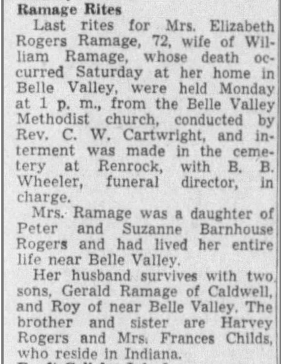 | Rogers Ramage | Elizabeth “Lizzie” | 1941 | “Ramage Rites,” Elizabeth Rogers Ramage obituary, The Times Recorder (Zanesville, Ohio), 24 Jun 1941, p. 7, col. 1. GKH MRCA: Hull |