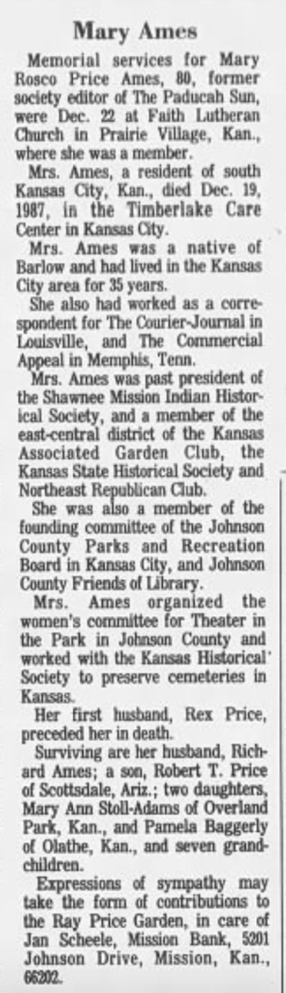 | Rasco Price Ames | Mary W. | 1988 | “Mary Ames,” obituary, The Paducah Sun-Democrat (Paducah, Kentucky), 7 Jan 1988, p. 9, col. 4. KFH MRCA: Elias Brack and Martha Mariah Felts |