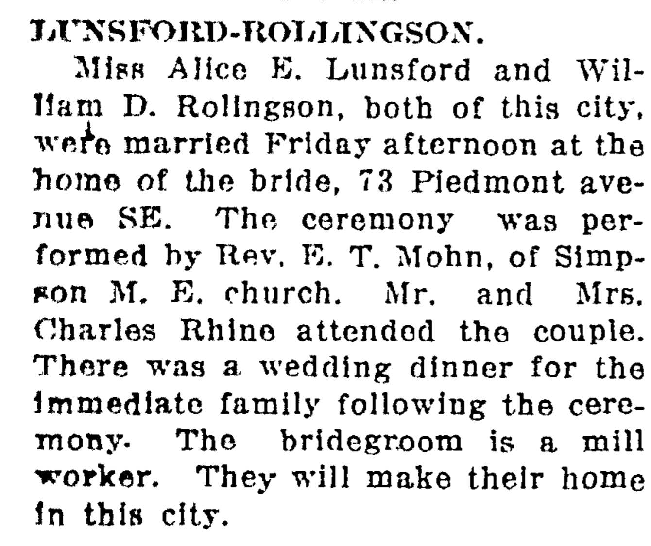 | Rollingson | William Delbert | 1917 | “Lunsford–Rollingson,” marriage announcement, Repository (Canton, Ohio), 7 Apr 1917, p. 10, col. 1. KFH MRCA: Jesse Thomas and Catherine “Katy” Ader |